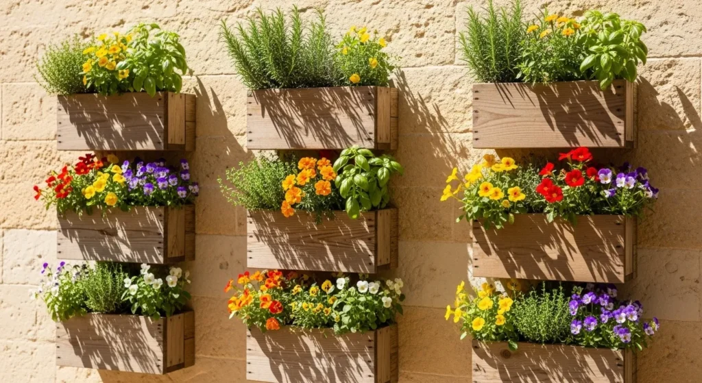 Wooden planter boxes create a warm, natural look while providing practical vertical gardening space. Herbs like basil, thyme, and rosemary can be planted together for easy access during cooking. Wooden boxes also bring texture and charm to indoor or outdoor walls.