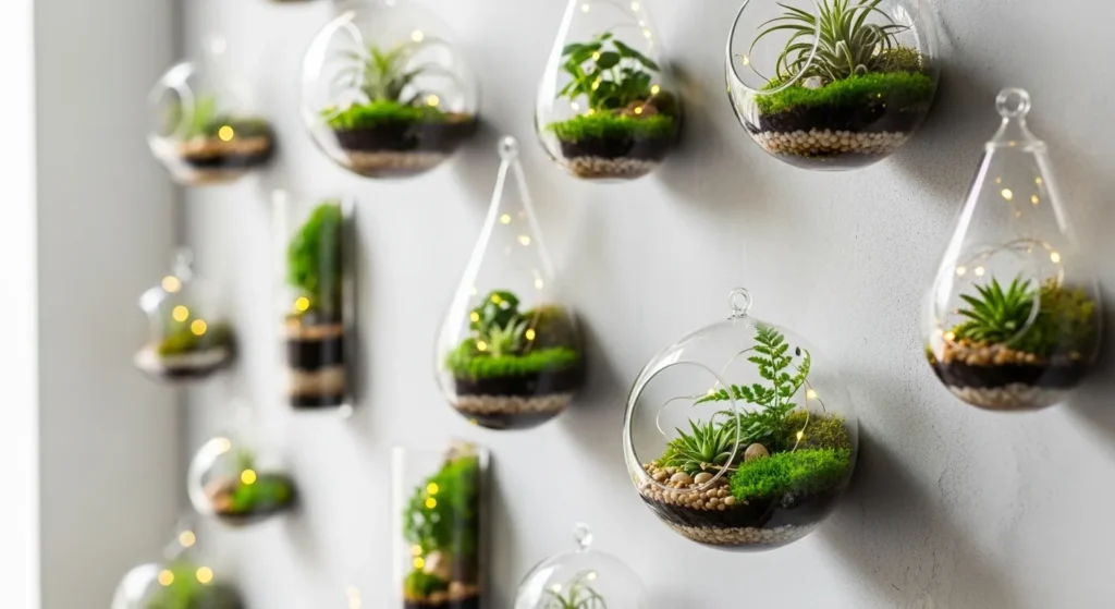 Glass terrariums hanging from wall-mounted hooks or rails create a stylish, airy vertical garden. Small succulents, moss, or air plants thrive in these enclosed setups while adding a decorative element to walls.