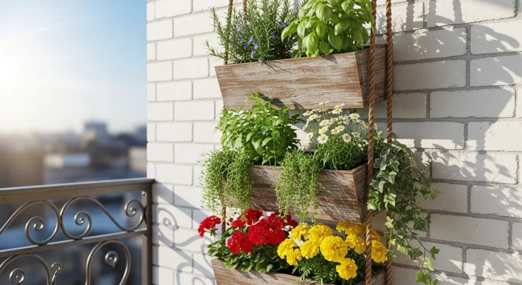 Tiered hanging planters maximize vertical space by stacking multiple plants in a single area. Each tier holds herbs, succulents, or trailing plants, creating a cascading green effect. This design works well for small balconies or indoor walls.