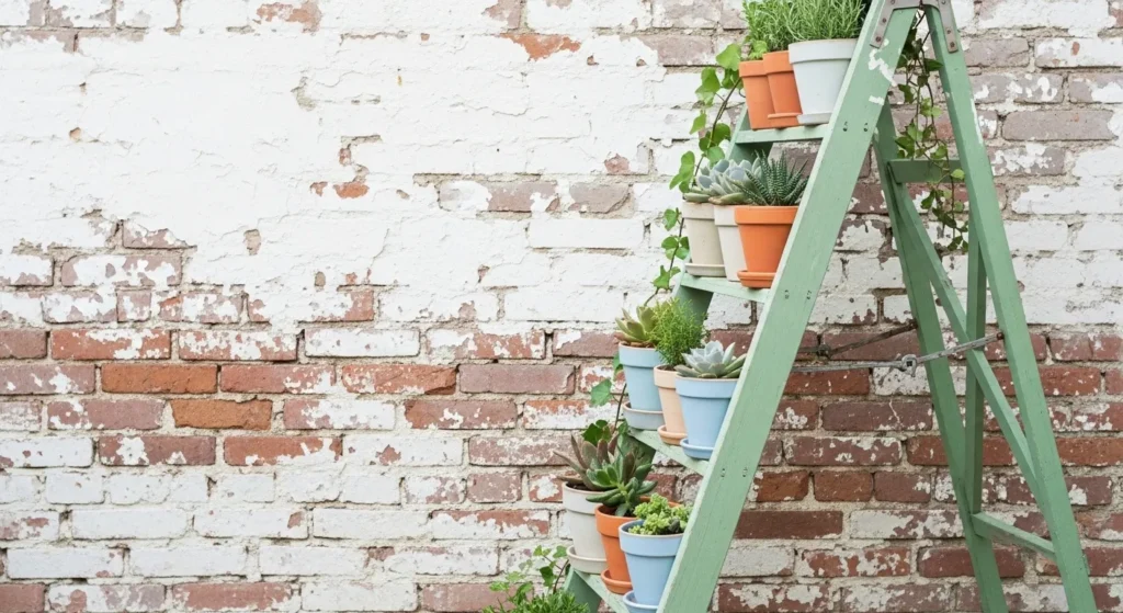 Repurposed ladders can be mounted horizontally or leaned against walls to hold pots and planters. Each rung or shelf provides planting space while adding rustic character to your wall.