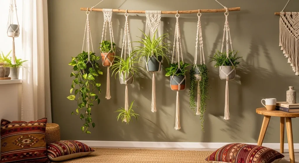 Macramé planters bring texture and charm to vertical gardening. Pots hang at different heights, allowing trailing or small plants to flourish. This solution works for indoor or covered outdoor walls.