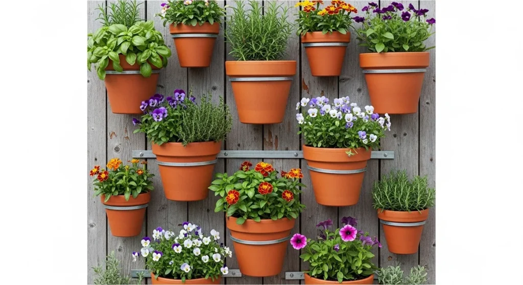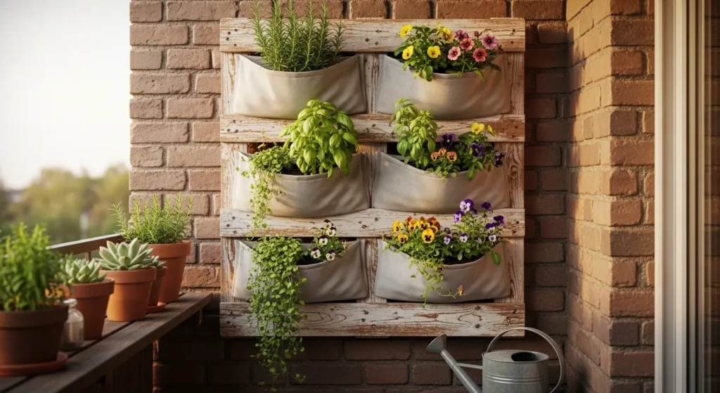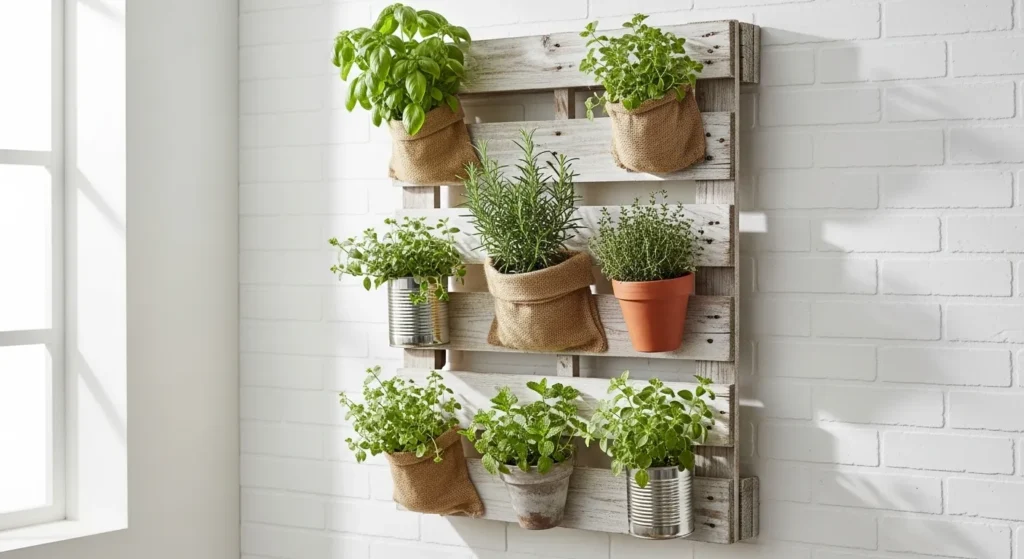 Repurposed pallets provide rustic charm while serving as vertical gardening structures. Attach small pots, pockets, or trays to grow multiple herbs or flowers. The natural wood adds texture and warmth to any space.