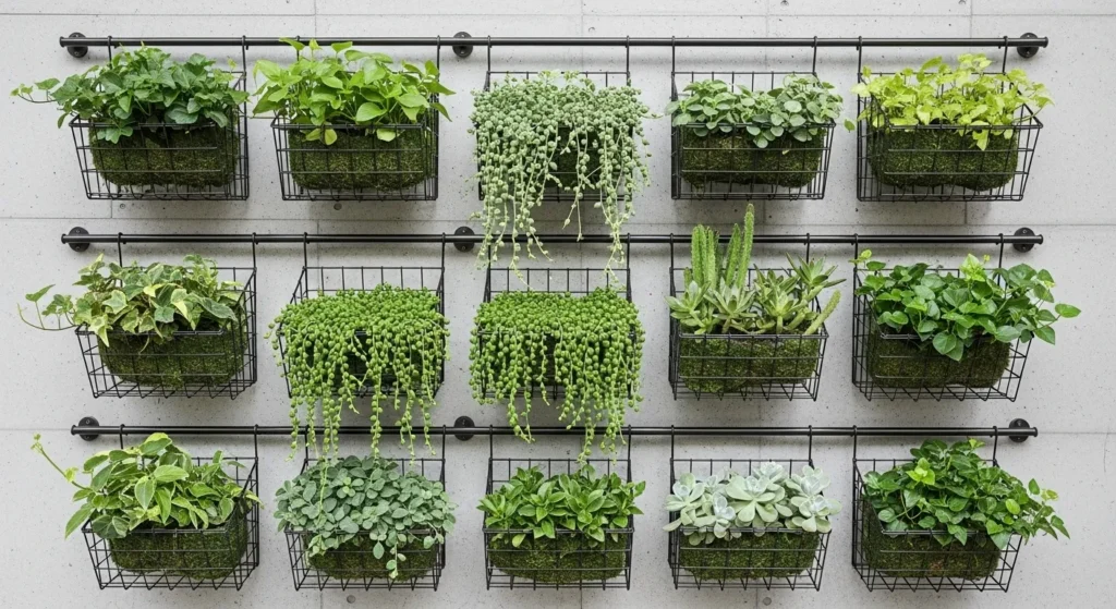 Mix basket materials like wicker, metal, or fabric for texture. This system is perfect for balconies, patios, or kitchen walls, creating a functional and decorative vertical garden that is Pinterest-ready.