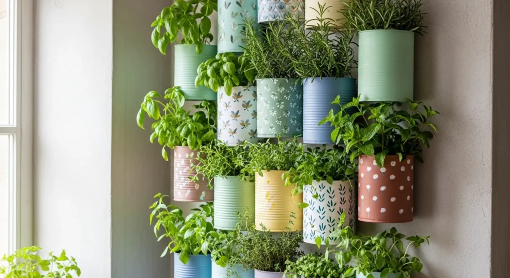 Recycled cans are an inexpensive and eco-friendly way to create a vertical garden. Paint or decorate cans to match your decor, and mount them on walls using brackets or rails.