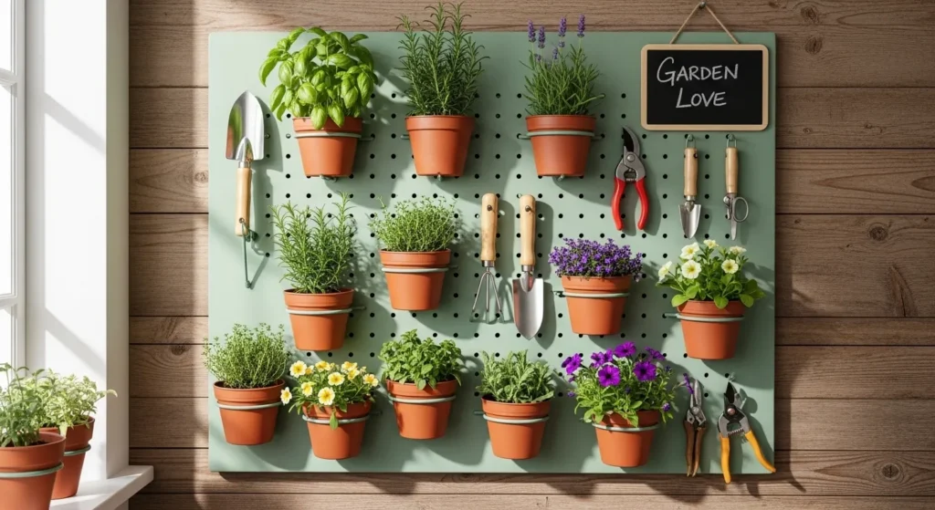 Pegboards can hold hooks, shelves, or baskets for vertical gardening. Plants, tools, or small pots hang neatly while allowing flexibility to move items as needed. The wall becomes both functional and decorative.