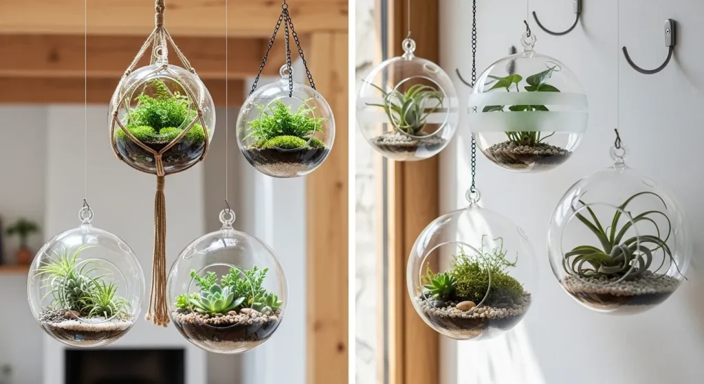 Arrange terrariums at varying heights for dimension. Use ropes or metal hangers to complement interior style. This method brings greenery indoors while keeping surfaces free, ideal for Pinterest-inspired interiors.