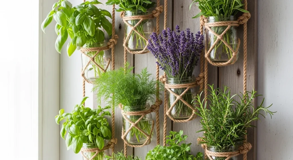 Mason jars can be hung in rows from wooden planks or rails, creating a charming herb wall. Clear jars allow you to see soil levels and roots while making it easy to grab fresh herbs when cooking.