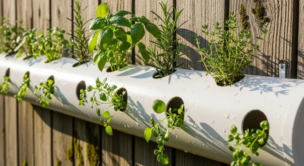 PVC pipes can be cut and mounted to create inexpensive vertical planters. Holes allow soil and plants to grow while the pipes are lightweight and durable. Herbs or succulents thrive in this setup.