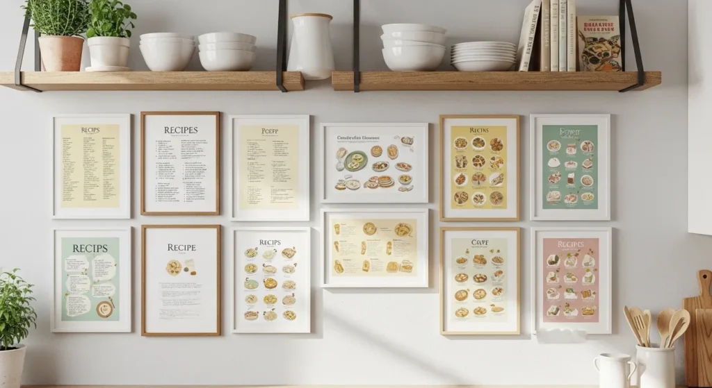 Arrange them in a neat row or a creative collage above counters or near the dining area. Using matching frames or shadow boxes ensures the display feels curated and cohesive, giving your kitchen a warm, homey, and timeless aesthetic.