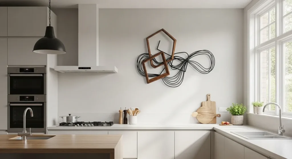 Wall sculptures in metal or wood introduce texture and dimension. They’re an artistic alternative to framed prints, providing depth while complementing cabinets, countertops, and other decor.