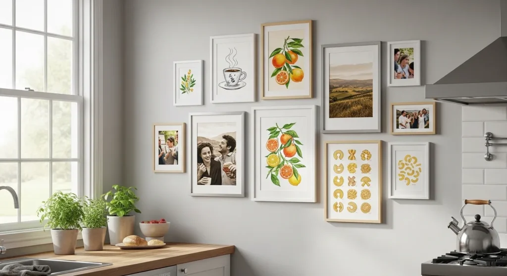 Floating frame collages add visual interest and personality to your kitchen. By combining different sizes and styles of frames, you can showcase family recipes, artwork, or favorite food photography in a cohesive gallery arrangement.
