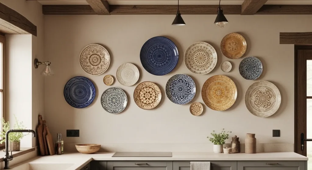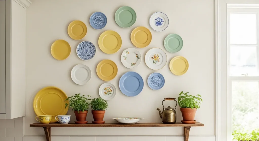 Decorative plates add color, texture, and charm to your kitchen walls. You can mix vintage ceramics, patterned designs, or colorful modern plates to create a unique display that’s visually engaging.