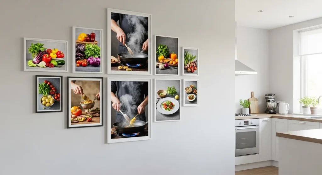 Hang them near preparation areas for both inspiration and practicality. Matching frame styles or coordinating colors ensures the display complements the overall kitchen aesthetic while keeping it lighthearted and lively.