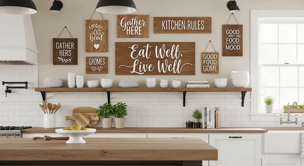 Wooden typography signs bring warmth and character to the kitchen. Rustic finishes or painted wood boards provide texture and a homey, welcoming feel while communicating personality or culinary philosophy.