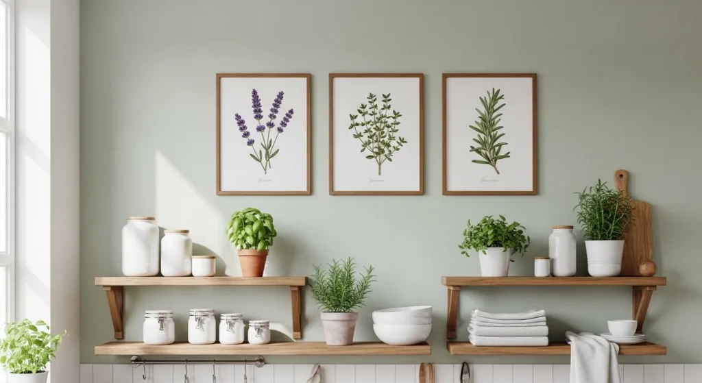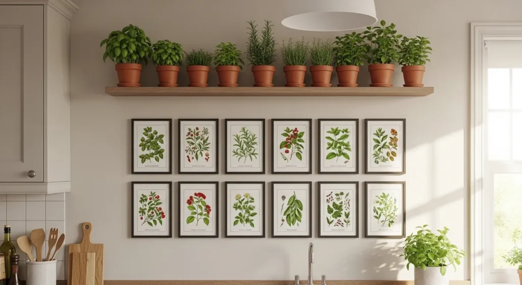 Botanical herb illustrations add freshness and a natural vibe to your kitchen. Prints featuring basil, rosemary, or thyme complement green plants or actual herbs on windowsills, creating a cohesive, lively display.