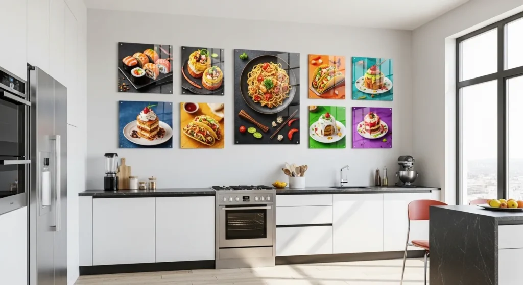 Acrylic or glass prints add a sleek, contemporary edge to kitchen walls. The glossy finish amplifies color and light, making food images or abstract art pop while reflecting natural light to energize the space.