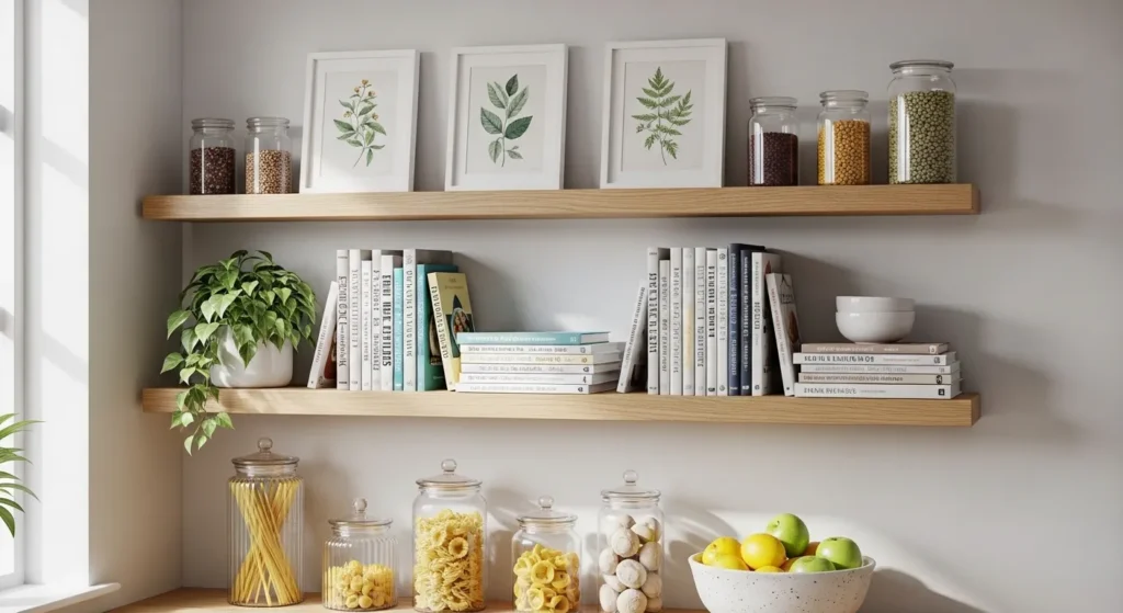 Use two or three shelves arranged vertically or horizontally. This setup allows easy rotation of artwork, seasonal decor, or even recipe cards, keeping your kitchen walls fresh, practical, and full of personality.