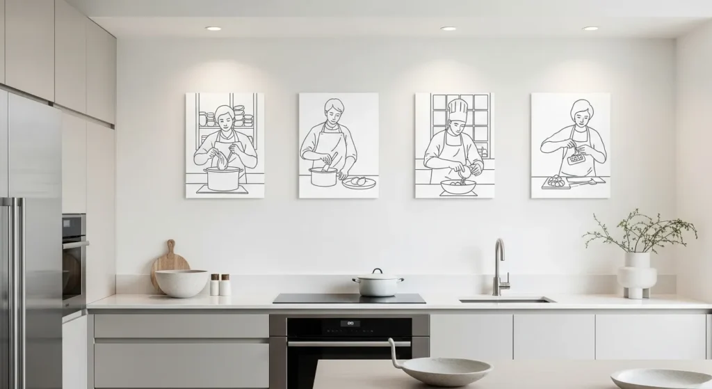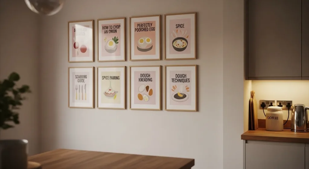 Illustrated cooking tips or step-by-step guides combine learning and style. Fun sketches or diagrams of chopping techniques, spice pairings, or recipe hacks create a visually interesting and educational wall.