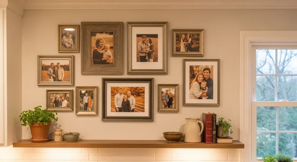Adding personal family photos transforms your kitchen walls into a warm, sentimental space. Images of loved ones enjoying meals or cooking together enhance the welcoming and homely atmosphere.