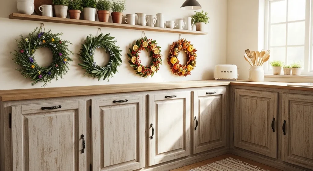Hang wreaths above dining areas, windows, or islands. Changing the herbs or wreaths seasonally keeps the kitchen looking refreshed while maintaining a rustic, cozy, and inviting atmosphere.