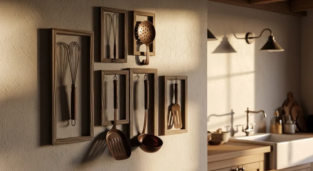 Framing vintage utensils like wooden spoons, whisks, or rolling pins adds charm and nostalgia to your kitchen. These pieces create a connection to traditional cooking while doubling as decorative wall art.