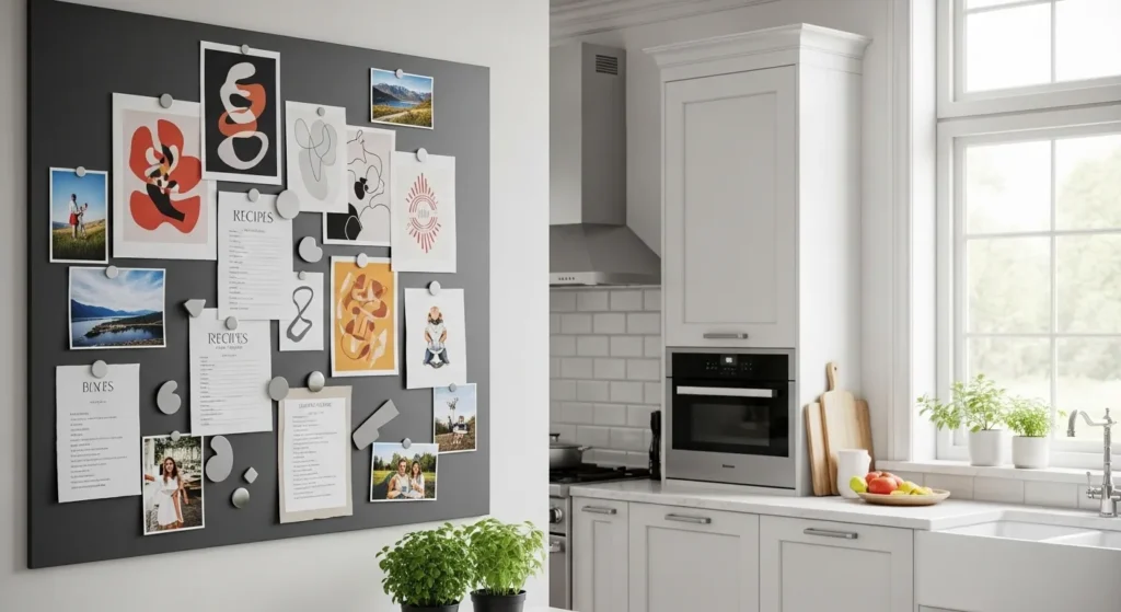 Magnetic boards are perfect for rotating art or family photos. They allow you to swap prints, recipe ideas, or inspirational messages without committing to permanent fixtures, keeping your kitchen dynamic and personalized.
