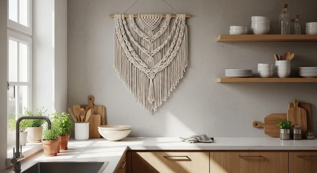 Macrame wall hangings introduce texture and warmth to kitchen walls. Their soft, woven design contrasts with hard surfaces like counters, tiles, or cabinets, adding visual balance and a cozy, tactile element.