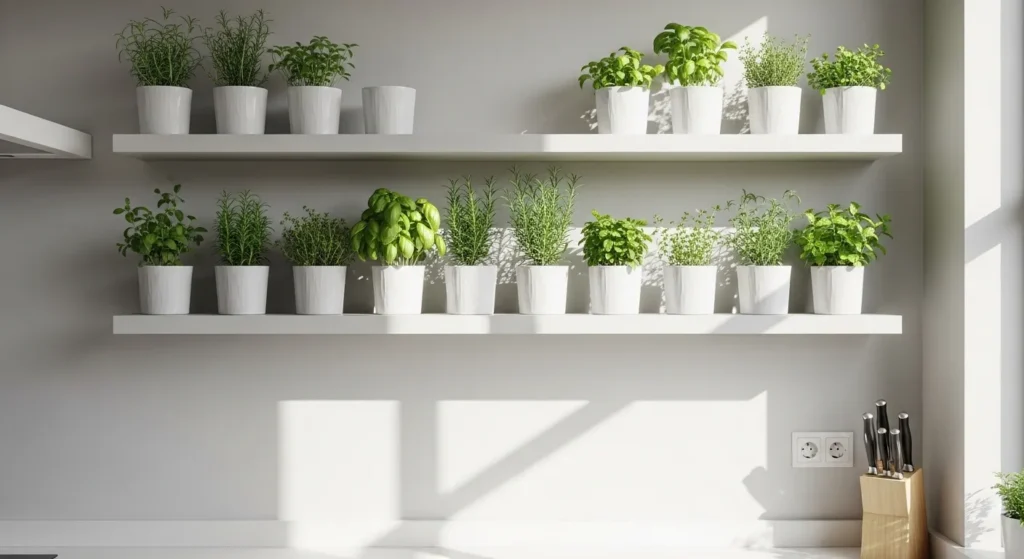 A floating shelf herb garden combines practicality with decor. Small pots with basil, thyme, or rosemary add greenery, fragrance, and a natural vibe while keeping your ingredients within reach.