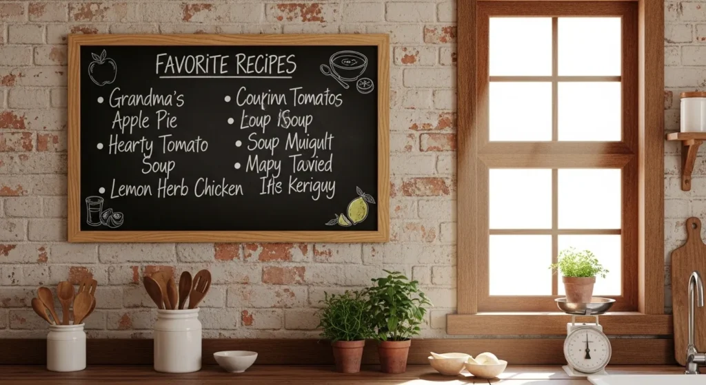 A chalkboard recipe wall allows you to display favorite family recipes or rotating seasonal dishes. The handwritten element adds personality and charm, giving the kitchen a lived-in, welcoming feel.