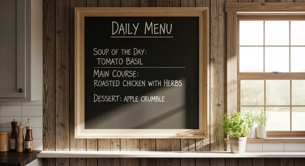 Place the chalkboard in a central cooking area where it can be referenced easily. Framing it neatly ensures it blends with other wall decor while keeping the look organized and inviting.