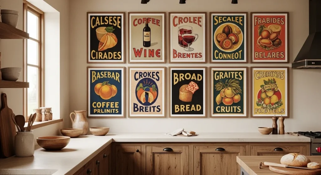 Vintage food posters introduce nostalgic charm and a splash of color. Prints of old-fashioned advertisements, wine labels, or classic pantry goods add visual interest and a sense of history.