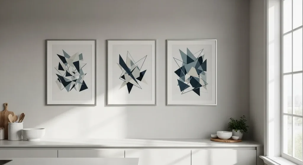 Abstract prints bring a contemporary, artistic touch to your kitchen. Bold shapes, muted tones, or soft pastels can complement cabinet colors and kitchen appliances while making the wall feel dynamic.
