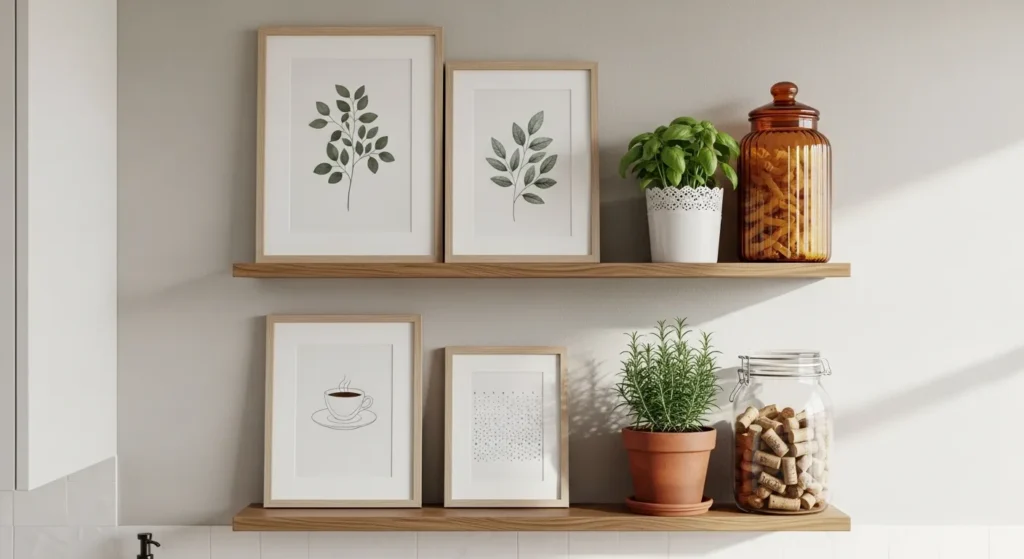 Floating shelves are perfect for layering kitchen art. Combine framed prints, small herb pots, or decorative jars to create a personalized and functional wall display.
