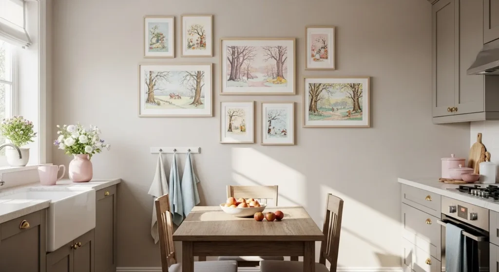 Switching art with the seasons keeps your kitchen feeling fresh and festive. Prints reflecting spring blooms, summer fruits, fall harvests, or winter holidays add color and excitement without permanent changes.